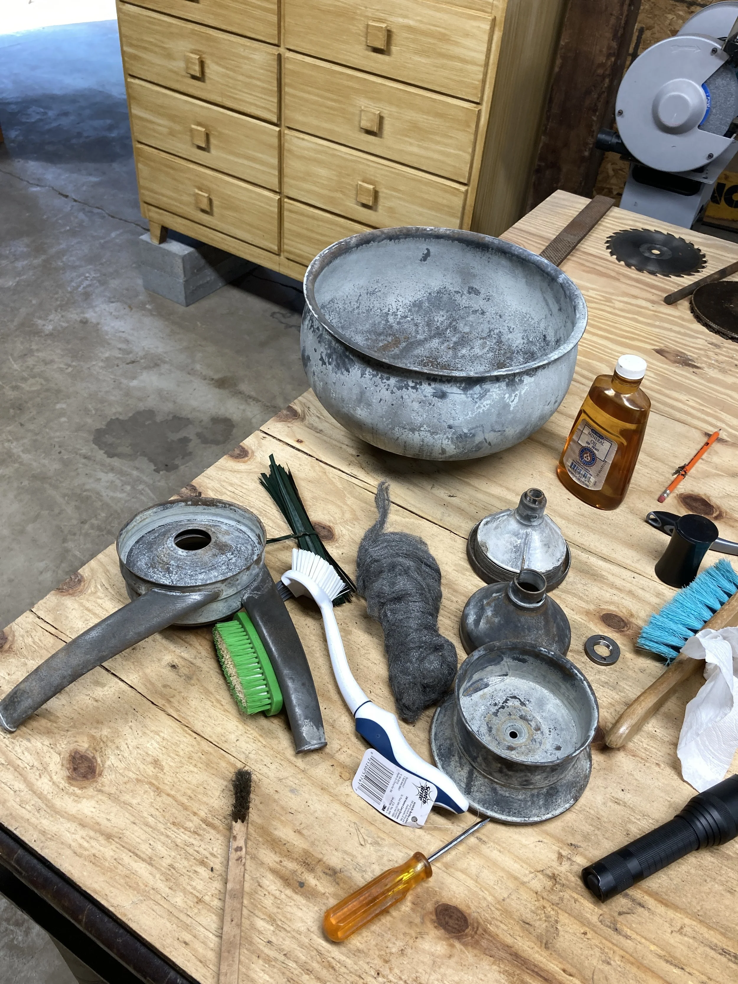 This was a huge project as I needed to completely disassemble it. By the time I got it completely apart, it consisted of about 30 pieces of hardware. After soaking in the bath for a few weeks, I began to pull out the pieces & using a variety of wire brushes, removed all the surface rust.