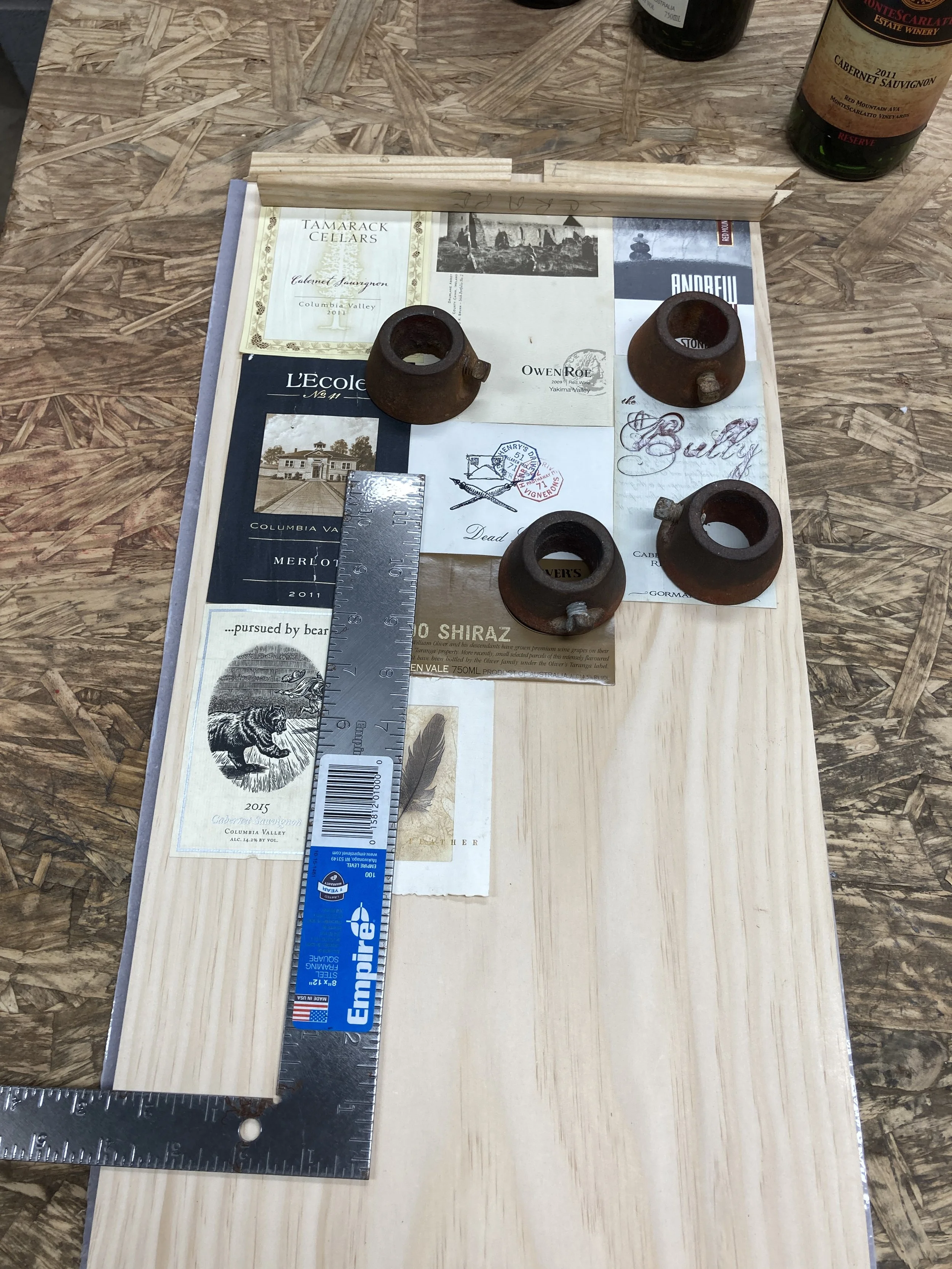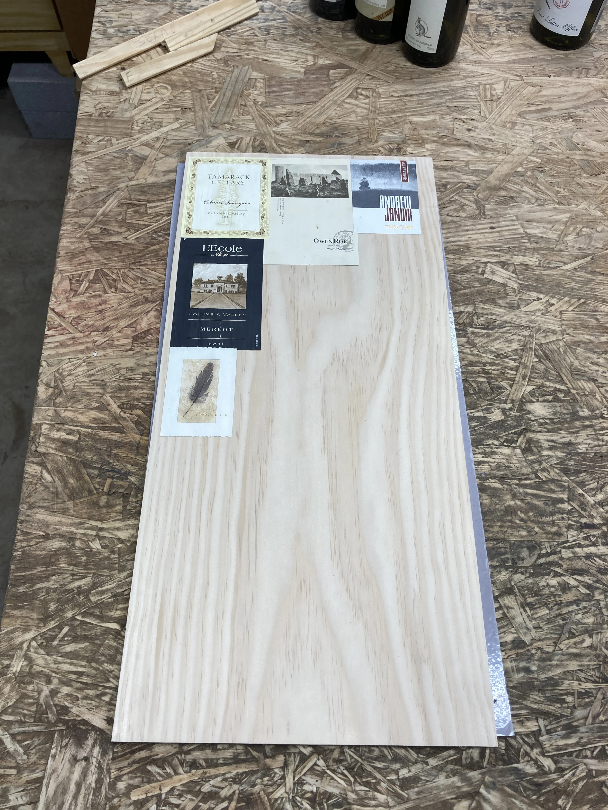 My next attempt is using wine labels & I’m going to glue them onto a clean board with no stain or sealer. I’m positioning them to cover the entire board instead of lining them up & spacing them the way I did before.