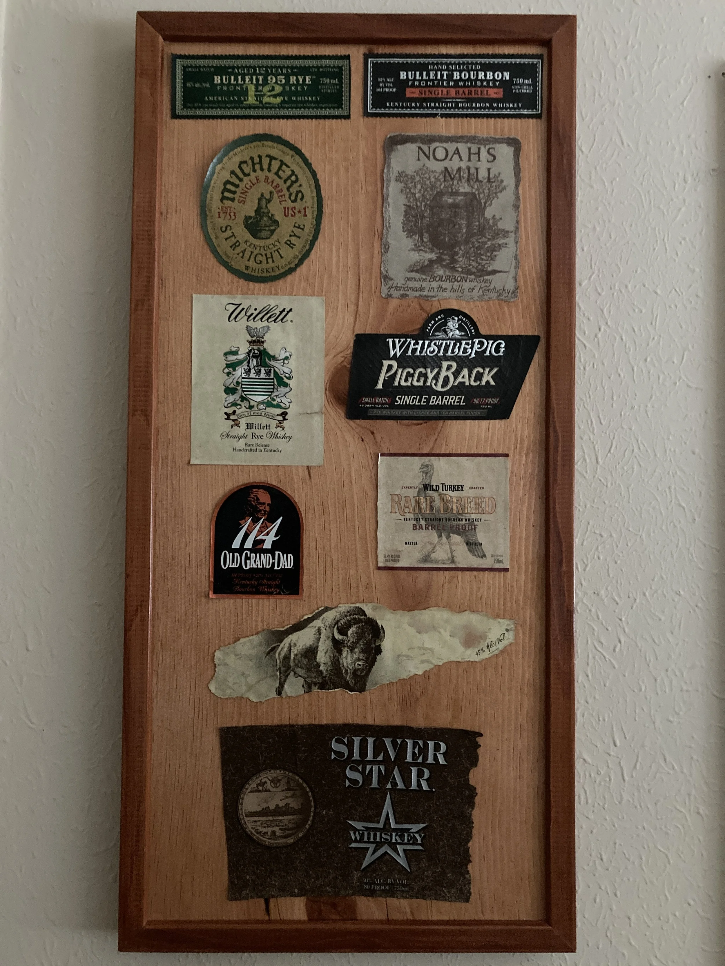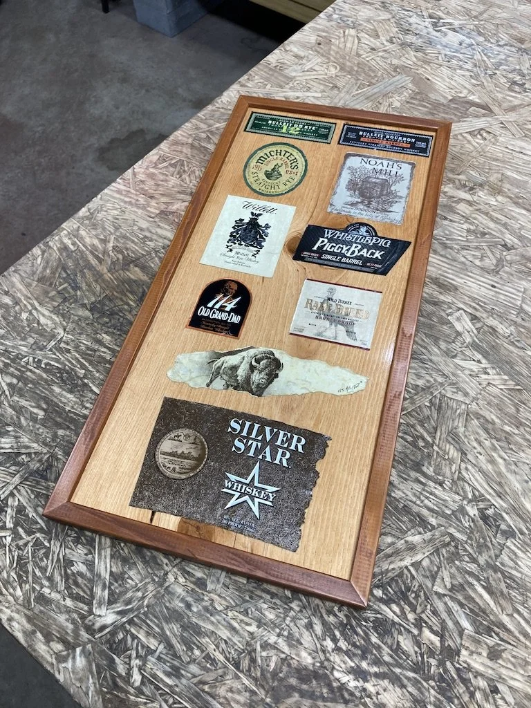 I finished the first board finally using whiskey labels. I stained the board & then used a photo spray contact glue to mount the labels. Unfortunately, I failed to realize that the glue is a water based spray glue & the stain & polyurethane sealer I used is oil based. Needless to say, the oil base broke down the glue & the labels started peeling up. I tried a few different glues but none of them would allow the labels to adequately adhere to the oil based surface.